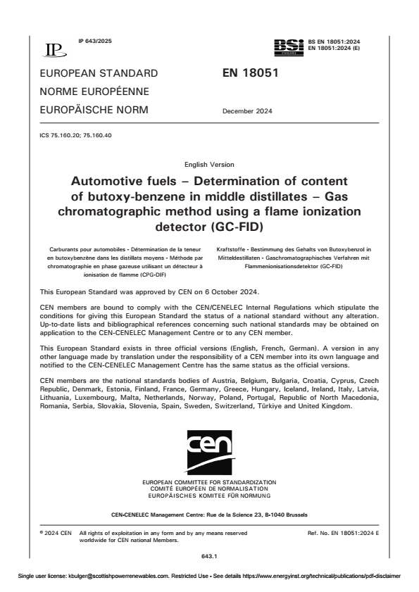 Automotive fuels _ Determination of content of butoxy-benzene in middle distillates _ Gas chromatographic method using a flame ionization detector GC-FID